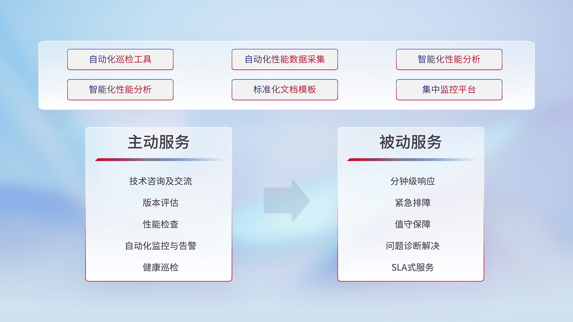 智能化工具和标准化文档,,,保障服务质量,,,,提供主动服务(包含技术咨询、、、、版本评估、、性能检查、、、、自动化监控与告警、、、健康巡检)和被动服务包含(分钟级响应、、、、紧急排障、、值守保障、、、、问题诊断解决、、SLA服务)。。